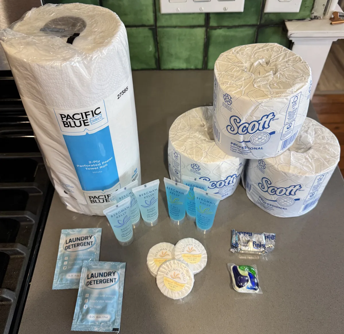 Replacing toilet paper, paper towels, soaps, and coffee.